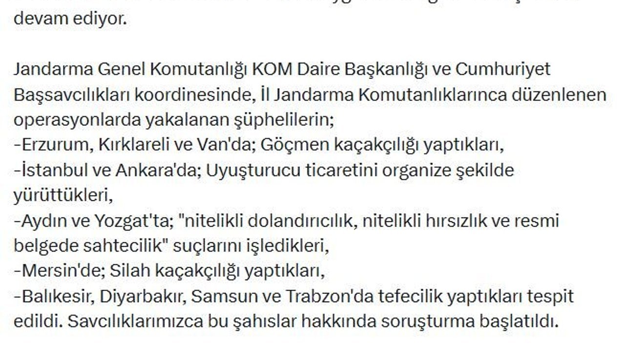 Bakanlığın sanal medya hesabından yapılan açıklamaya göre; jandarma tarafından düzenlenen operasyonlarda, hesaplarında 4 milyar 119 milyon TL'lik işlem hareketi bulunan 83 şüpheli yakalandı. Şüphelilerin 49'u çıkarıldıkları hakimliklerce tutuklandı, 23'ü hakkında adli kontrol hükümleri uygulandı. Diğerlerinin işlemleri devam ediyor. Jandarma Genel Komutanlığı KOM Daire Başkanlığı ve Cumhuriyet Başsavcılıkları koordinesinde yürütülen soruşturmalarda şüphelilerin; Erzurum, Kırklareli ve Van'da göçmen kaçakçılığı yaptıkları, İstanbul ve Ankara'da uyuşturucu ticaretini organize şekilde yürüttükleri, Aydın ve Yozgat'ta 'Nitelikli dolandırıcılık', 'Nitelikli hırsızlık' ve 'Resmi belgede sahtecilik' suçlarını işledikleri, Mersin'de silah kaçakçılığı yaptıkları, Balıkesir, Diyarbakır, Samsun ve Trabzon'da tefecilik yaptıkları tespit edildi. (DHA)