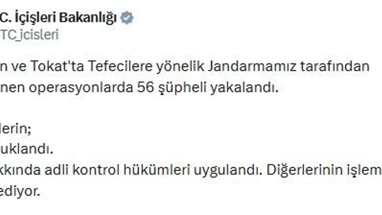 Bakanlığın sanal medya hesabından yapılan açıklamaya göre; Karaman ve Tokat'ta tefecilere yönelik jandarma tarafından düzenlenen operasyonlarda 56 şüpheli yakalandı. Şüphelilerin 25'i tutuklandı, 18'i hakkında adli kontrol hükümleri uygulandı. Diğerlerinin işlemleri devam ediyor.