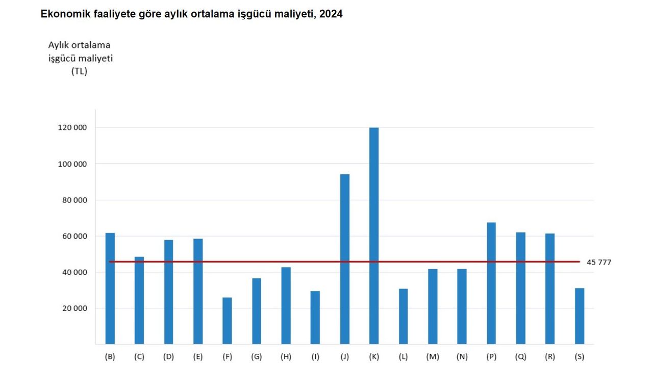 TÜİK, 2024 yılına ilişkin iş gücü maliyeti istatistiklerini açıkladı. Buna göre 2024 yılında aylık ortalama iş gücü maliyeti 45 bin 777 TL olarak gerçekleşti. Finans ve sigorta faaliyetleri sektörü, 119 bin 868 TL ile aylık ortalama iş gücü maliyetinin en yüksek olduğu sektör oldu. Bu sektörü, 94 bin 96 TL ile bilgi ve iletişim ve 67 bin 397 TL ile eğitim sektörü izledi. İnşaat sektörü ise 26 bin 47 TL ile aylık ortalama iş gücü maliyetinin en düşük olduğu sektör oldu. Bu sektörü 29 bin 460 TL ile konaklama ve yiyecek hizmeti faaliyetleri ve 30 bin 929 TL ile gayrimenkul faaliyetleri sektörleri takip etti.