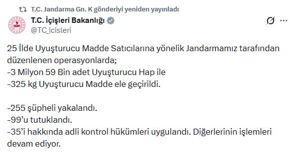 Bakanlığın sanal medya hesabından yapılan açıklamaya göre; sokak satıcılarının sanal medya ve mesajlaşma programları üzerinden uyuşturucu sattıkları ve uyuşturucu ticaretini organize şekilde yürüttüklerinin tespit edilmesi üzerine İl Jandarma Komutanlıklarınca 960 narkotik ve asayiş ekibi, 5 bin 760 personelin katılımıyla 25 ilde operasyonlar düzenlendi. Operasyonlarda; 3 milyon 59 bin uyuşturucu hap ile 325 kilogram uyuşturucu madde ele geçirildi. 255 şüpheli yakalandı, 99'u tutuklandı, 35'i hakkında adli kontrol hükümleri uygulandı. Diğerlerinin işlemleri devam ediyor. (DHA)