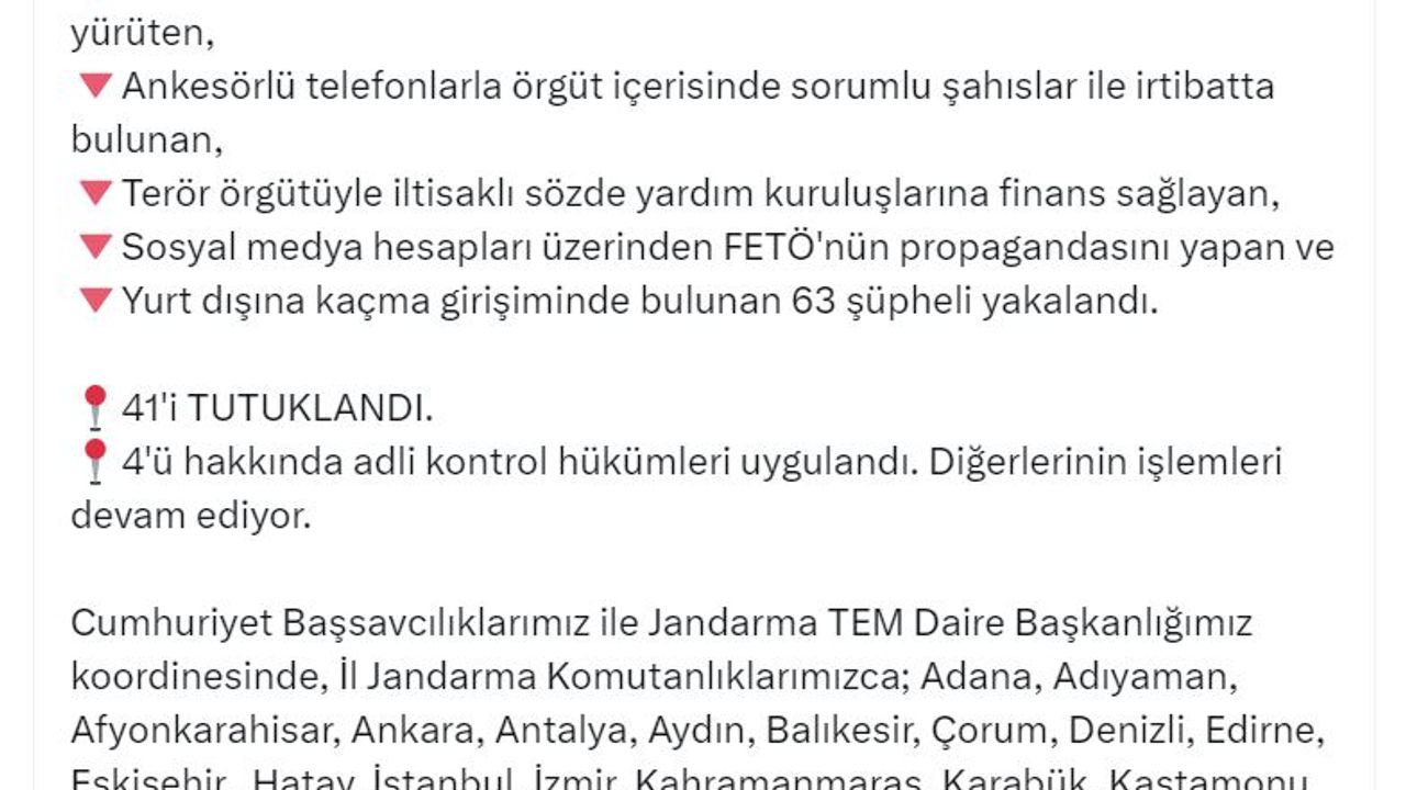 ANKARA, (DHA)- İÇİŞLERİ Bakanı Ali Yerlikaya, son 2 haftada jandarma tarafından 29 ilde FETÖ'ye yönelik düzenlenen operasyonlarda 63 şüphelinin yakalandığını ve bunlardan 41'inin tutuklandığını duyurdu.