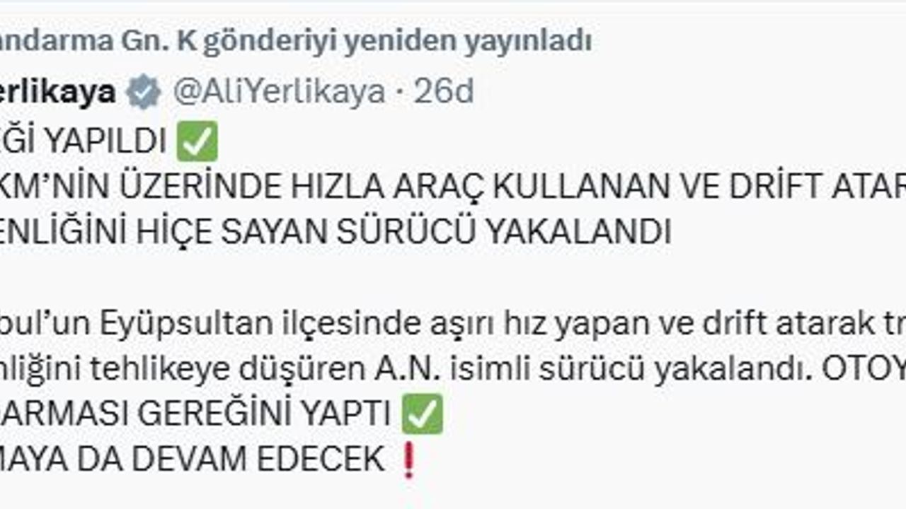 Bakan Yerlikaya, sanal medya hesabından 'Gereği yapıldı' notu ile yaptığı açıklamada, 'İstanbul'un Eyüpsultan ilçesinde aşırı hız yapan ve drift atarak trafik güvenliğini tehlikeye düşüren A.N. isimli sürücü yakalandı. Otoyol jandarması gereğini yaptı, yapmaya da devam edecek. Sürücü hakkında; TCK'nın 179'uncu maddesinden adli işlem yapıldı. Yeni Trafik Kanunu Teklifi'ne göre; drift atan sürücüye, 140 bin TL idari para cezası uygulayacağız, sürücü belgesini 60 gün süreyle geri alacağız ve aracını 60 gün süreyle trafikten men edeceğiz. Geriye doğru 5 yıl içerisinde 2'nci defa ihlalde ise sürücü belgesini iptal edeceğiz. Yerleşim yeri dışında mevcut hız sınırını 71 kilometre/saat ve üzeri aşan otomobil sürücülerine 30 bin TL idari para cezası uygulayacağız ve sürücü belgesi 90 gün süreyle geri alacağız. (Trafik ihlalinin meydana geldiği otoyol güzergahının hız sınırı 140 km olmasına rağmen bu otomobil 300 kilometrenin üzerinde hız yapmaktadır.) Ortalama hızdaki yüzde 5'lik bir düşüş ölüm riskini yüzde 30 oranında azaltabilmektedir. Unutmayalım; trafik, herkesin ortak yaşam alanıdır. Bu tür davranışlarda bulunan sürücüleri gördüğünüzde lütfen 112 Acil Çağrı Merkezimize bildirin. Biz gereğini yaparız' ifadelerini kullandı. (DHA)