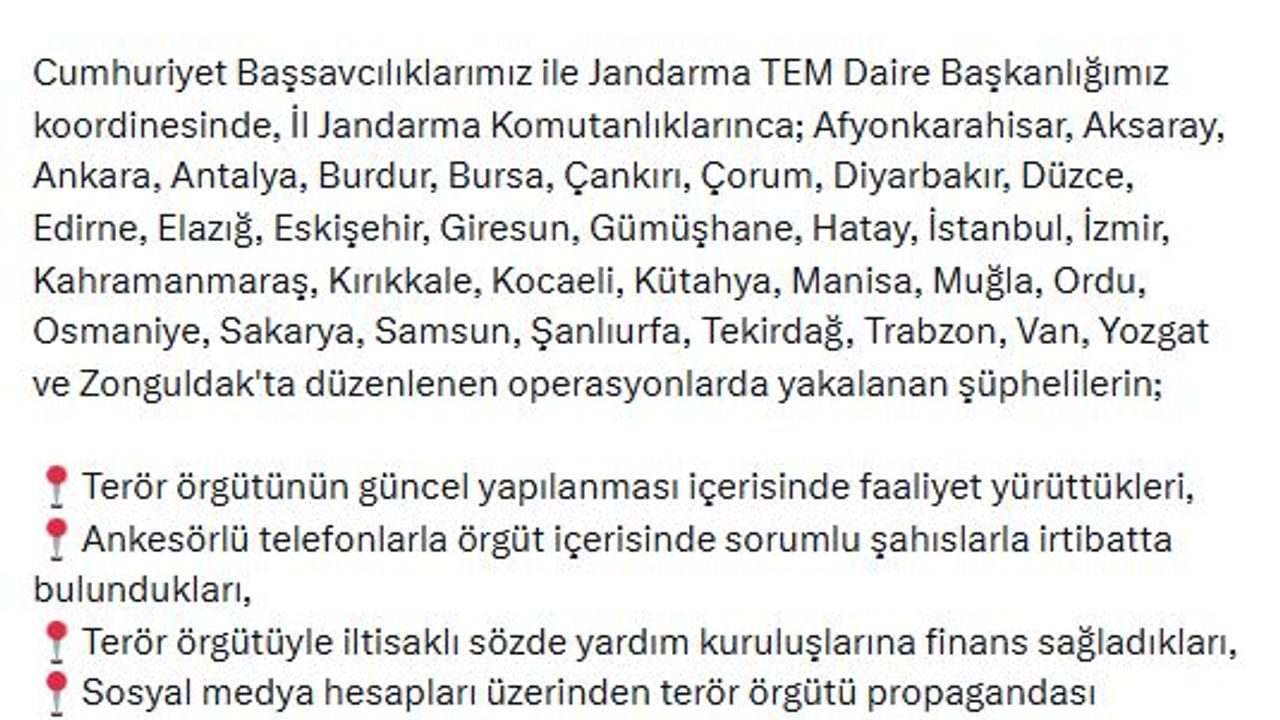 İçişleri Bakanı Yerlikaya'nın sanal medya hesabından yaptığı açıklamaya göre; 34 ilde FETÖ'nün güncel yapılanmasında yer aldıkları belirlenen şüphelilere yönelik soruşturma yürütüldü. Şüphelilerin ankesörlü telefonlarla örgüt sorumluları ile irtibatta bulundukları, örgüte iltisaklı sözde yardım kuruluşlarına finans sağladıkları ve sanal medya üzerinden terör örgütü propagandası yaptıkları tespit edildi. 34 ilde 2 haftadır devam eden operasyonlarda 77 şüpheli, yakalandı. Şüphelilerin 43'ü tutuklandı, 1'i hakkında adli kontrol hükümleri uygulandı. Diğerlerinin işlemleri devam ediyor. Bakan Yerlikaya, 'Milli iradeye karşı kurulan tuzaklar bir bir bozuluyor. Devletimizin bütünlüğüne, milletimizin huzuruna kastedenlerle mücadelemiz kararlılıkla devam ediyor. Emeği geçenleri tebrik ediyorum' dedi. (DHA)