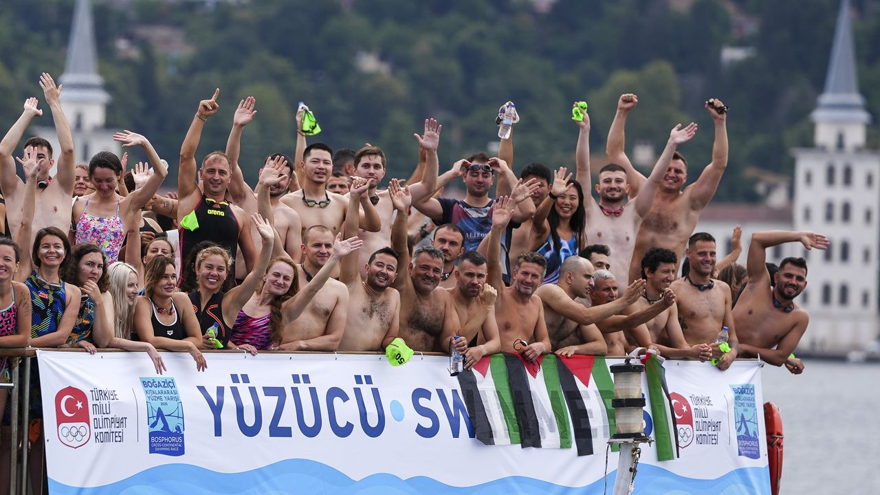 Yarışmaya katılan bazı yüzücüler, elindeki bayraklarla Filistin'e destek verdi.