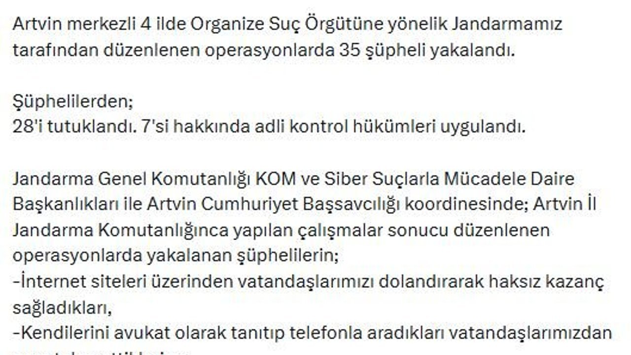 Bakanlığın sanal medya hesabından yapılan açıklamaya göre, Artvin Cumhuriyet Başsavcılığı koordinesinde jandarma tarafından düzenlenen operasyonlarda 35 şüpheli yakalandı. Şüphelilerin, internet siteleri üzerinden vatandaşları dolandırarak haksız kazanç sağladıkları, kendilerini avukat olarak tanıtıp telefonla aradıkları vatandaşlardan para talep ettikleri ve ödeme yapmayanları tehdit ettikleri tespit edildi. Şüphelilere ait 75 milyon TL değerinde 2 taşınmaz, 5 taşınır mülk ve 333 banka hesabına tedbir kararı uygulandı.