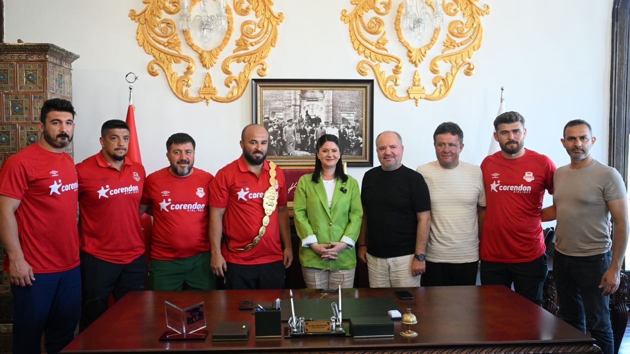 EDİRNE (AA) - 664. Tarihi Kırkpınar Yağlı Güreşleri Başpehlivanı Orhan Okulu, Edirne Belediye Başkanı Filiz Gencan Akın'ı ziyaret etmesi sonrası memleketi Antalya'ya hareket etti.