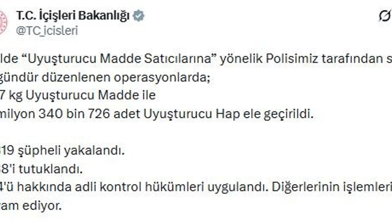 Bakanlığın sanal medya hesabından yapılan açıklamaya göre; Cumhuriyet başsavcılıkları koordinesinde İl Emniyet Müdürlükleri tarafından 10 gündür düzenlenen operasyonlara 1980 ekip, 4 bin 950 personel katıldı, 21 hava aracı ve 43 narkotik dedektör köpeğinden yararlanıldı. Operasyonlarda; 767 kilogram uyuşturucu madde ile 3 milyon 340 bin 726 uyuşturucu hap ele geçirildi, 1319 şüpheli yakalandı. Şüphelilerden 638'i çıkarıldıkları hakimliklerce tutuklandı, 174'ü hakkında adli kontrol hükümleri uygulandı. Diğerlerinin işlemleri devam ediyor. (DHA)