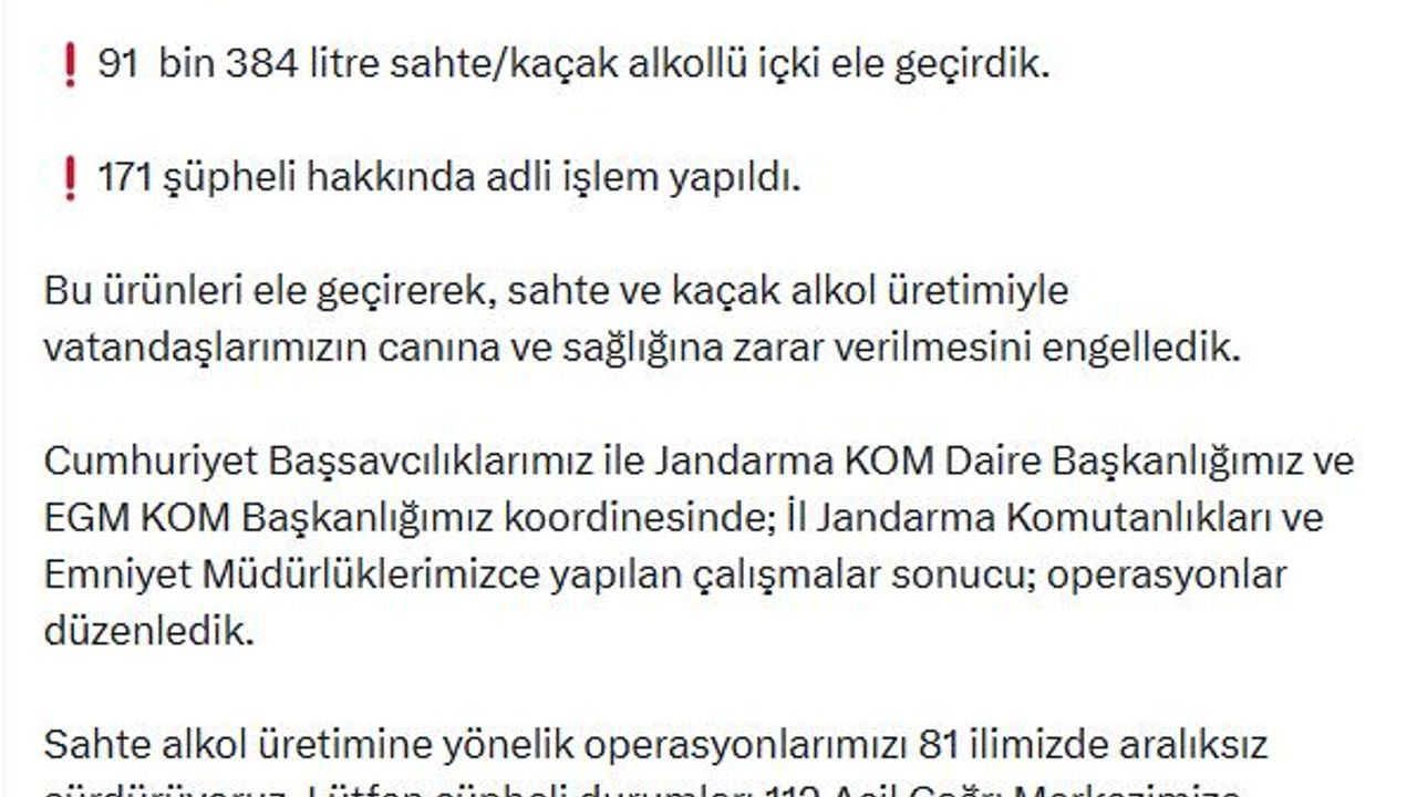 Bakan Yerlikaya, jandarma ve polis tarafından son bir haftadır düzenlenen operasyonları sanal medya hesabından duyurdu. Buna göre; yurt genelinde düzenlenen operasyonlarda 91 bin 384 litre sahte/kaçak içki ele geçirildi, 171 şüpheli hakkında adli işlem yapıldı. Yerlikaya, 'Sahte alkol üretimine yönelik operasyonlarımızı 81 ilimizde aralıksız sürdürüyoruz. Lütfen şüpheli durumları 112 Acil Çağrı Merkezimize bildirin. Biz gereğini yapalım. Emeği geçenleri tebrik ediyorum' ifadelerini kullandı. (DHA)