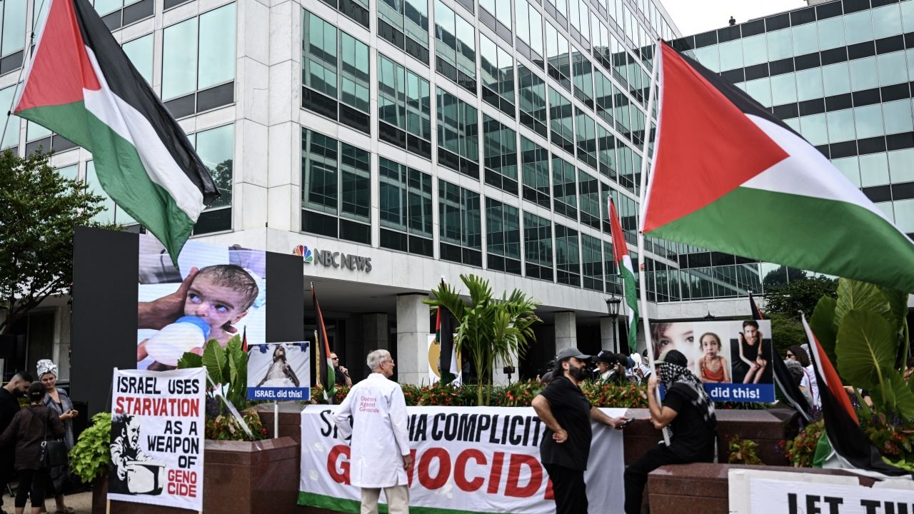 Filistin'i destekleyen göstericiler, başkent Washington'daki NBC, Fox News, MSNBC, The Hill gibi medya kuruluşlarının ofislerinin bulunduğu sokakta bir araya geldi.