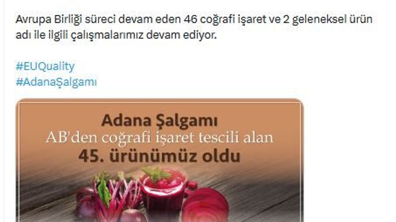Adana Ticaret Odası'nın 2024 yılında Adana şalgamı için yaptığı coğrafi işaret başvurusu sonuçlandı. AB'de yürütülen inceleme sürecinin ardından Adana şalgamının tescil süreci onaylandı. Türkiye Odalar ve Borsalar Birliği (TOBB) Başkanı Rifat Hisarcıklıoğlu, Adana şalgamının Avrupa Birliği'nden coğrafi işaret tescili alan 45'inci ürün olduğunu bildirdi. Hisarcıklıoğlu, sanal medya hesabından yaptığı paylaşımda 'Adana'ya ve ülkemize hayırlı olsun. Yerel değerlerimize sahip çıkan Adana Ticaret Odası Başkanımız Yücel Bayram'ı, yönetim kurulunu, meclisini ve emeği geçen herkesi kutluyorum. Dünyada çok az coğrafyaya nasip olan bir ürün çeşitliliğine sahibiz. TOBB ve oda-borsa camiası olarak yerel ve coğrafi işaretli ürünler için yoğun çaba sarf ediyoruz. AB süreci devam eden 46 coğrafi işaret ve 2 geleneksel ürün adıyla ilgili çalışmalarımız sürüyor' ifadelerine yer verdi. (DHA)