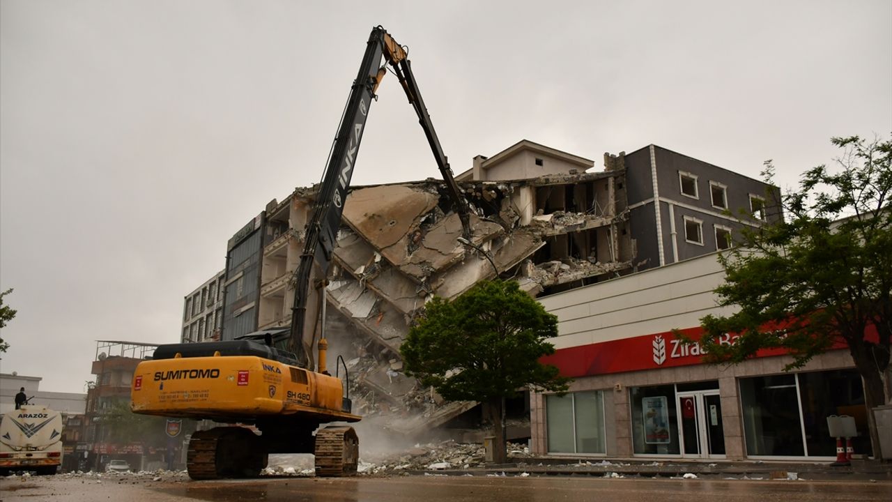İlçede ağır hasar alan 5 katlı bina, iş makineleri tarafından kontrollü şekilde yıkıldı.