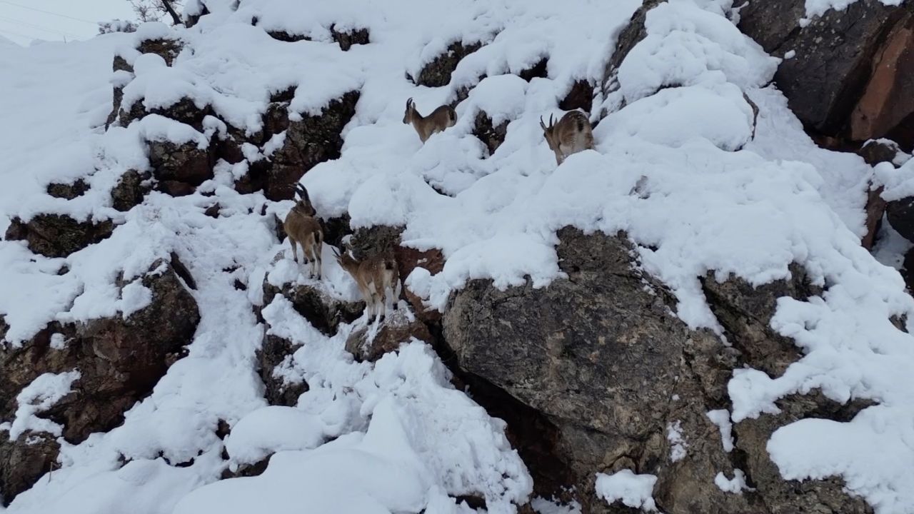 Yaban keçilerinin yiyecek arayışı dronla görüntülendi.