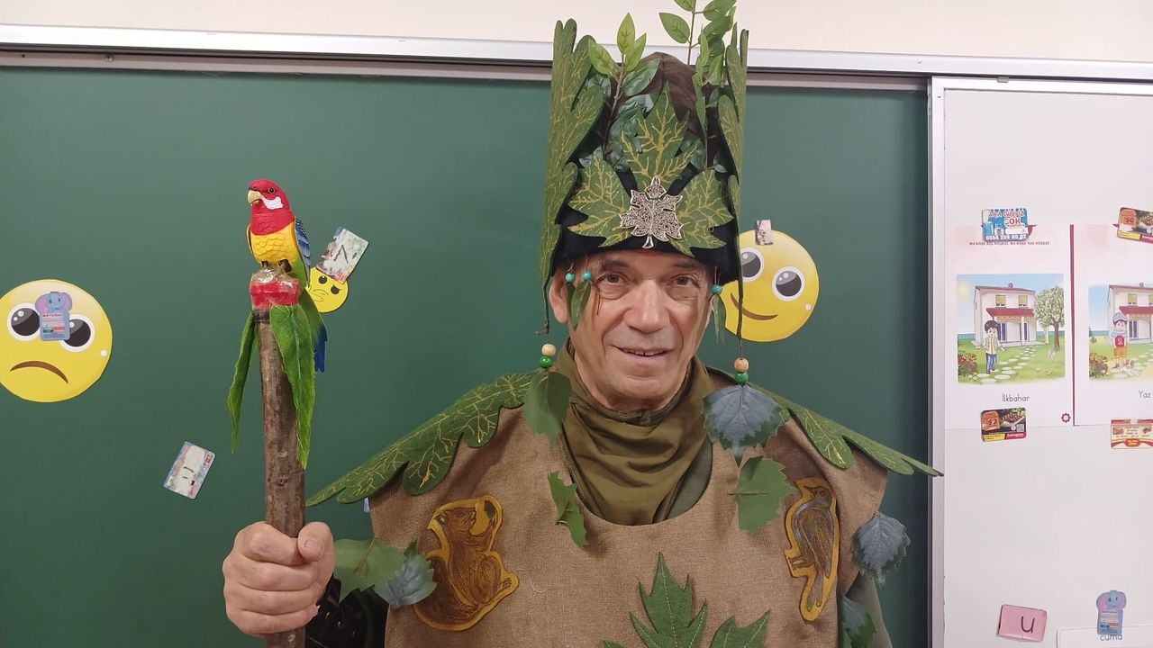 Mustafa Göçer, '7 yaşımdan beri dağlarda fidan dikiyorum. Aynı zamanda eğitime de önem vermeye başladım. Son 15-20 yıldır okullara açıldım. Okullarda çok güzel karşılanıyordum. Ama çocuklarda görsel hafızayla canlandırmak için bir elbise yaptırmaya karar verdim. Elbiseyi de Kayseri'de Mezar Sanat Evi'ne yaptırdım. Ben de birtakım ilaveler yaptım. Çocuklardan nasıl tepki alacağımı çok merak ediyordum. Hilal Hoca ile telefonla konuştuk, 'Böyle bir elbise yaptırdım, çocukların tepkisini ölçebilir miyiz' dedim. O da 'Tabii ki' dedi. Kendisi zaten doğayı ve hayvanları seven bir insan. Beni okula davet etti. Okula geldim. Gerçekten de çocukların tepkisi çok güzeldi. Bu elbiseyi iyi ki yaptırmışım. Bu elbiseyi yapan Mezar Sanat Evi'ne ve beni bu okula davet eden başta çok değerli müdürümüz olmak üzere çok değerli öğretmenlerimize çok teşekkür ediyorum. Öğretmenlerimiz de çok güzel bir özveri gösterdiler' diye konuştu.