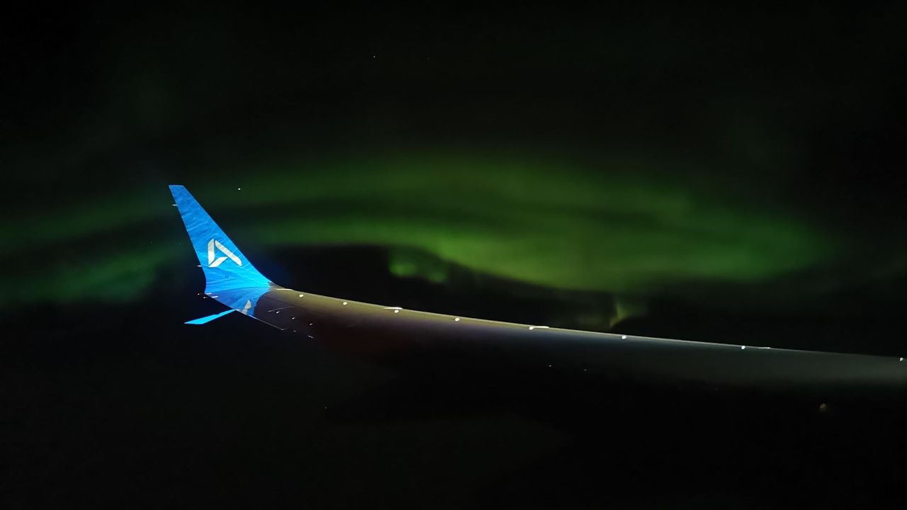 TC-OHT tescilli uçak, ABD'den Türkiye'ye uzanan yolculuğu sırasında Grönland üzerinden geçerken Kuzey Işıkları eşliğinde dikkat çekici görüntüler oluşturdu. Gökyüzünde oluşan bu doğal manzara, AJet logosuyla etkileyici bir görsel şölen sundu.