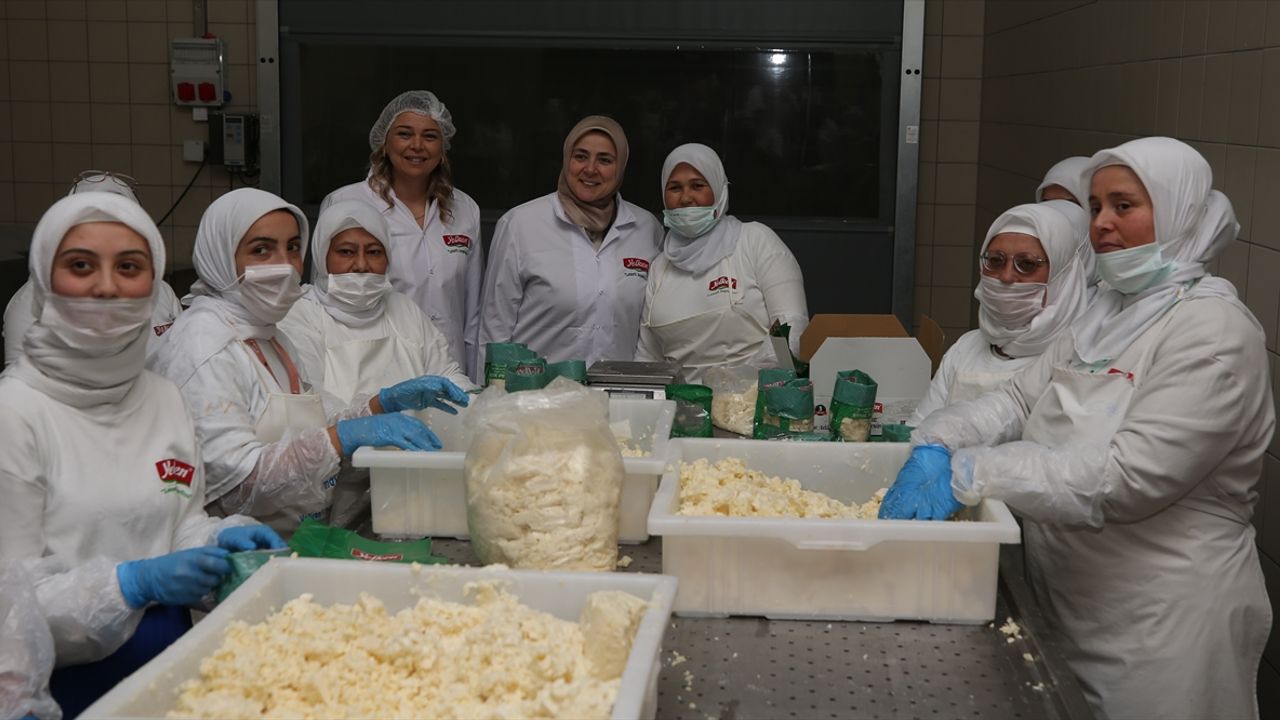 Peynir üretim aşamalarını inceleyen Ercan, işletmede çalışan kadınlarla hatıra fotoğrafı çektirdi.