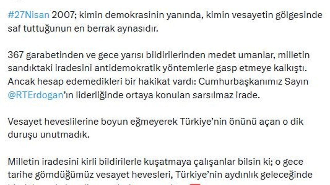 AK Parti'li Acar, sanal medya hesabından yaptığı açıklamada, '27 Nisan 2007; kimin demokrasinin yanında, kimin vesayetin gölgesinde saf tuttuğunun en berrak aynasıdır. 367 garabetinden ve gece yarısı bildirilerinden medet umanlar, milletin sandıktaki iradesini antidemokratik yöntemlerle gasp etmeye kalkıştı. Ancak hesap edemedikleri bir hakikat vardı. Cumhurbaşkanımız Sayın Recep Tayyip Erdoğan'ın liderliğinde ortaya konulan sarsılmaz irade. Vesayet heveslilerine boyun eğmeyerek Türkiye'nin önünü açan o dik duruşu unutmadık. Milletin iradesini kirli bildirilerle kuşatmaya çalışanlar bilsin ki o gece tarihe gömdüğümüz vesayet hevesleri, Türkiye'nin aydınlık geleceğinde bir daha asla kendine yer bulamayacaktır' ifadelerini kullandı. (DHA)