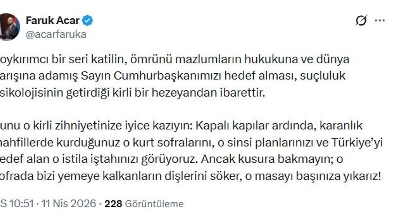 AK Parti Genel Başkan Yardımcısı Faruk Acar, sanal medya hesabı üzerinden yaptığı paylaşımda, 'Soykırımcı bir seri katilin, ömrünü mazlumların hukukuna ve dünya barışına adamış Sayın Cumhurbaşkanımızı hedef alması, suçluluk psikolojisinin getirdiği kirli bir hezeyandan ibarettir. Şunu o kirli zihniyetinize iyice kazıyın: Kapalı kapılar ardında, karanlık mahfillerde kurduğunuz o kurt sofralarını, o sinsi planlarınızı ve Türkiye'yi hedef alan o istila iştahınızı görüyoruz. Ancak kusura bakmayın; o sofrada bizi yemeye kalkanların dişlerini söker, o masayı başınıza yıkarız' ifadelerine yer verdi. (DHA)