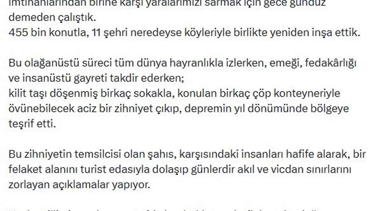 AK Parti'li Acar, sanal medya hesabından yaptığı açıklamada, 'Şaka gibi, utanmıyorlar da. Birçok ülkeden daha büyük bir coğrafyada, tarihin en ağır imtihanlarından birine karşı yaralarımızı sarmak için gece gündüz demeden çalıştık. 455 bin konutla, 11 şehri neredeyse köyleriyle birlikte yeniden inşa ettik. Bu olağanüstü süreci tüm dünya hayranlıkla izlerken, emeği, fedakarlığı ve insanüstü gayreti takdir ederken; kilit taşı döşenmiş birkaç sokakla, konulan birkaç çöp konteyneriyle övünebilecek aciz bir zihniyet çıkıp, depremin yıl dönümünde bölgeye teşrif etti. Bu zihniyetin temsilcisi olan şahıs, karşısındaki insanları hafife alarak, bir felaket alanını turist edasıyla dolaşıp günlerdir akıl ve vicdan sınırlarını zorlayan açıklamalar yapıyor. Kaybettiğimiz canlara ve geride bıraktıkları acılı ailelere duyduğumuz saygıdan, edebimizden, 'Bugün siyaset konuşulmaz' diyerek sustuk. Ancak ar damarı çatlamış, aklı pusulasını yitirmiş, gerçekle bağını koparmış bir muhalefet genel başkanıyla karşı karşıyayız. Felaketin ve yıkımın büyüklüğünü sahada gerçek anlamda görmedikleri için şehirlerimizin nasıl ihya edildiğini, hangi emeklerle ayağa kaldırıldığını da idrak edemediklerinin farkındayız. Bu tabloyu görmezden gelerek yalanla, çarpıtmayla ve açık bir acziyetle savrulan bu siyasetin hükmünü aziz milletimizin vicdanına havale ediyoruz. İnsan utanır. Onca emeğe, onca yapılan işe rağmen hakkı teslim etmek yerine siyasi cambazlığa devam edenler bilmelidir ki bu millet, samimiyetsizliğe de istismara da asla prim vermez. Acıyı propaganda malzemesine çeviren bu anlayış, ne milletin hafızasında ne de bu ülkenin siyasi ciddiyetinde bir yer bulur. Bu tavır, çaresizliğin en gürültülü halidir ve milletin nazarında hiçbir karşılık bulamayacaktır' ifadelerini kullandı. (DHA)