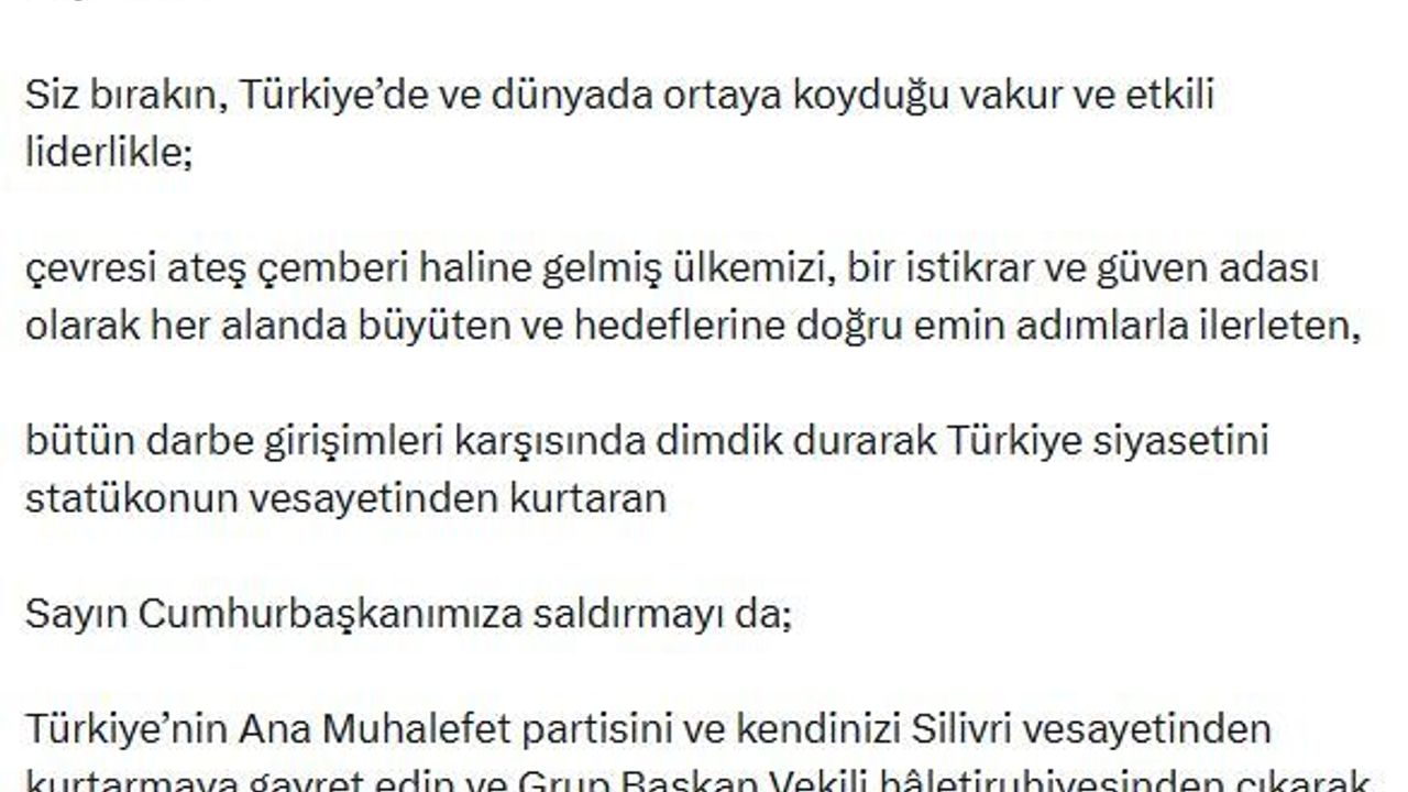 Efkan Ala, sanal medya hesabından yaptığı açıklamada, 'Sayın Özel, siz bırakın, Türkiye'de ve dünyada ortaya koyduğu vakur ve etkili liderlikle; çevresi ateş çemberi haline gelmiş ülkemizi, bir istikrar ve güven adası olarak her alanda büyüten ve hedeflerine doğru emin adımlarla ilerleten, bütün darbe girişimleri karşısında dimdik durarak Türkiye siyasetini statükonun vesayetinden kurtaran Sayın Cumhurbaşkanımıza saldırmayı da; Türkiye'nin ana muhalefet partisini ve kendinizi Silivri vesayetinden kurtarmaya gayret edin ve grup başkan vekili haletiruhiyesinden çıkarak genel başkan olmaya çalışın. Böylece ülkemize de partinize de katkıda bulunmuş olursunuz' dedi. (DHA)