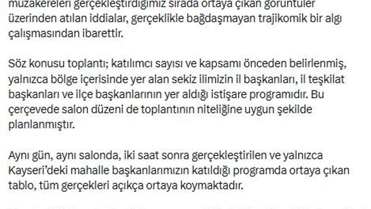 AK Parti'li Büyükgümüş, sanal medya hesabından yaptığı açıklamada, '10-11-12 tarihleri arasında Kayseri'de gerçekleştirdiğimiz Orta Anadolu Bölge Strateji Toplantısı'nın, kapanış konuşmasını yaptığım ve ardından müzakereleri gerçekleştirdiğimiz sırada ortaya çıkan görüntüler üzerinden atılan iddialar, gerçeklikle bağdaşmayan trajikomik bir algı çalışmasından ibarettir. Söz konusu toplantı; katılımcı sayısı ve kapsamı önceden belirlenmiş, yalnızca bölge içerisinde yer alan sekiz ilimizin il başkanları, il teşkilat başkanları ve ilçe başkanlarının yer aldığı istişare programıdır. Bu çerçevede salon düzeni de toplantının niteliğine uygun şekilde planlanmıştır. Aynı gün, aynı salonda, 2 saat sonra gerçekleştirilen ve yalnızca Kayseri'deki mahalle başkanlarımızın katıldığı programda ortaya çıkan tablo, tüm gerçekleri açıkça ortaya koymaktadır. Gazeteciliğin temel görevi, kamuoyunu doğru bilgilendirmektir. Gerçekleri araştırmadan, bağlamından koparılmış görüntüler üzerinden algı üretmek; ne basın etiğiyle ne de kamu sorumluluğuyla bağdaşır. Hakikat ortadadır. Yorum ise kamuoyunun takdirindedir' dedi. (DHA)
