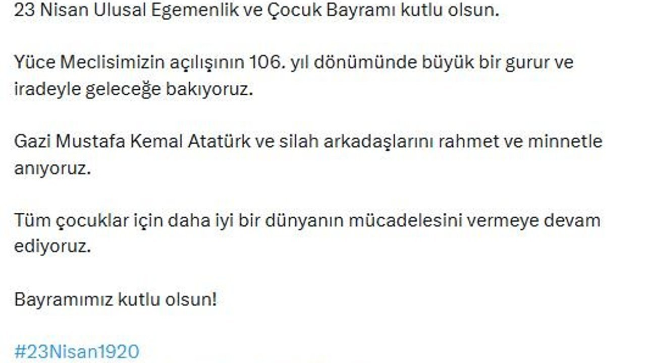 ANKARA, (DHA)- AK Parti Genel Başkan Yardımcısı ve Parti Sözcüsü Ömer Çelik, 23 Nisan Ulusal Egemenlik ve Çocuk Bayramı ile TBMM'nin kuruluşunun 106'ncı yıl dönümüne ilişkin mesaj paylaştı.