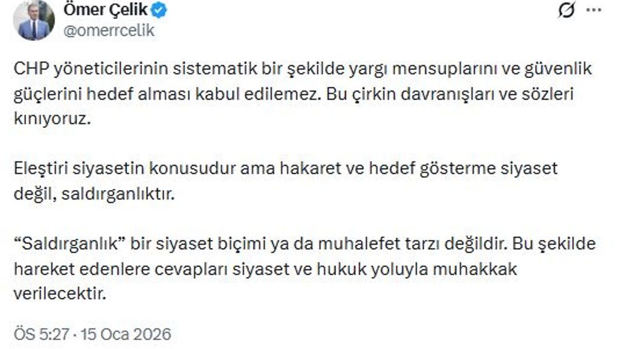 AK Parti'li Çelik, sanal medya hesabından yaptığı açıklamada, 'CHP yöneticilerinin sistematik bir şekilde yargı mensuplarını ve güvenlik güçlerini hedef alması kabul edilemez. Bu çirkin davranışları ve sözleri kınıyoruz. Eleştiri siyasetin konusudur ama hakaret ve hedef gösterme siyaset değil, saldırganlıktır. 'Saldırganlık' bir siyaset biçimi ya da muhalefet tarzı değildir. Bu şekilde hareket edenlere cevapları siyaset ve hukuk yoluyla muhakkak verilecektir' ifadelerini kullandı. (DHA)