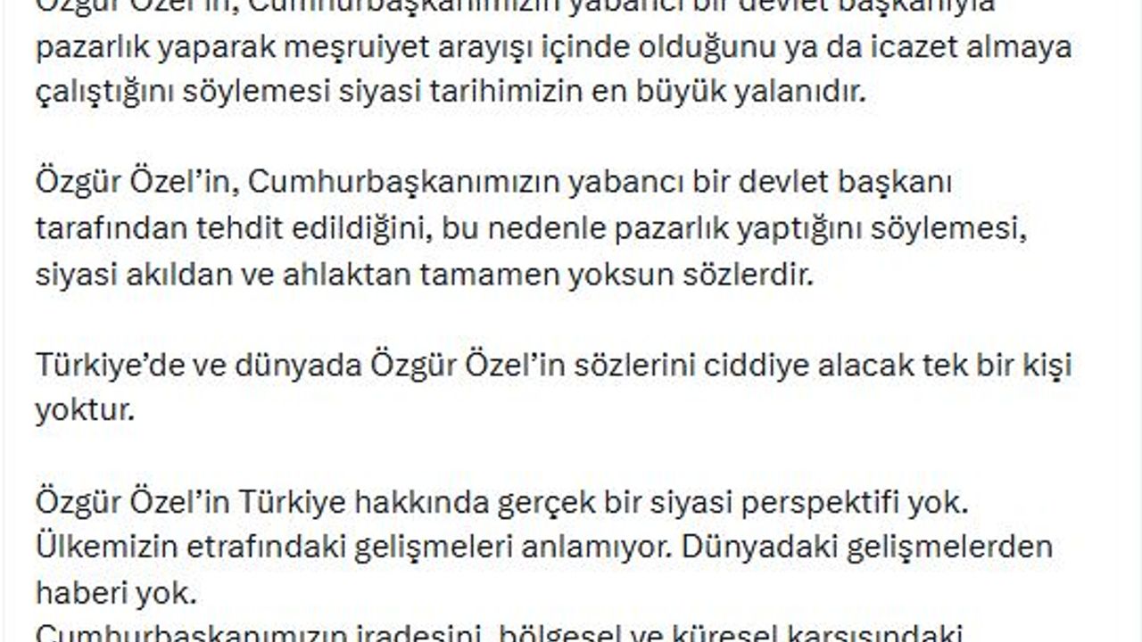 AK Parti'li Ömer Çelik, sanal medya hesabından yaptığı açıklamada, 'CHP Genel Başkanı Özgür Özel'in açıklamaları bir kere daha siyasi alanın dışına çıkmıştır. Özgür Özel siyaset yapmıyor, iftira üretim merkezi olarak çalışıyor. Her gün yalan siyasetinde yeni bir rekor kırıyor. Özgür Özel, siyasi tarihimizin en çirkin iftiralarını üretiyor. Özgür Özel'in, Cumhurbaşkanımızın yabancı bir devlet başkanıyla pazarlık yaparak meşruiyet arayışı içinde olduğunu ya da icazet almaya çalıştığını söylemesi siyasi tarihimizin en büyük yalanıdır. Özgür Özel'in, Cumhurbaşkanımızın yabancı bir devlet başkanı tarafından tehdit edildiğini, bu nedenle pazarlık yaptığını söylemesi, siyasi akıldan ve ahlaktan tamamen yoksun sözlerdir' dedi.