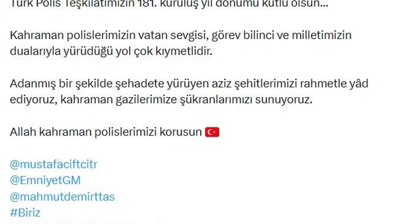 ANKARA, (DHA)- AK Parti Genel Başkan Yardımcısı ve Parti Sözcüsü Ömer Çelik, Türk Polis Teşkilatı'nın 181'inci kuruluş yıl dönümünü kutladı.