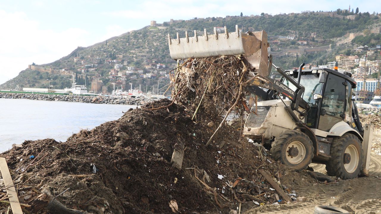 Yağışla birlikte taşan dereler, şehir merkezinden ve üst mahallelerden sürüklediği atıkları doğrudan denize taşıdı. Kuvvetli dalgaların etkisiyle derinlerde biriken plastik, cam, metal ve organik atıklar da yüzeye çıkarak sahillere savruldu. Turizm sezonunda binlerce kişinin kullandığı kumsallar, kısa sürede çöp alanına dönüştü. Sahilin atıklarla kaplanmasının ardından Alanya Belediyesi'ne bağlı iş makineleri sahili temizlemek için çalışma başlattı. (DHA)