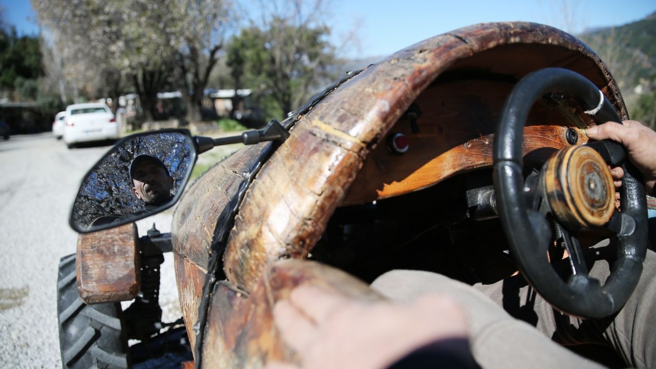 Yaklaşık 3 yıl önce doğada gördüğü büyük bir kütüğü atölyesine getirdiğini anlatan Say, "Çocukluk hayalim olan ağaçtan arabayı yapmam 3 yıl sürdü. Tek ağaç gövdesini oydum, sonra motor aksamına başladım. Farklı motorlar denedim. Her motoru kütüğe sığdıramadım. Sonuçta bu kütüğün içine uygun bir motor uydurduk ve oldu. Yapılacak işleri var ama artık sürebiliyor, arabayla gezebiliyoruz." diye konuştu.