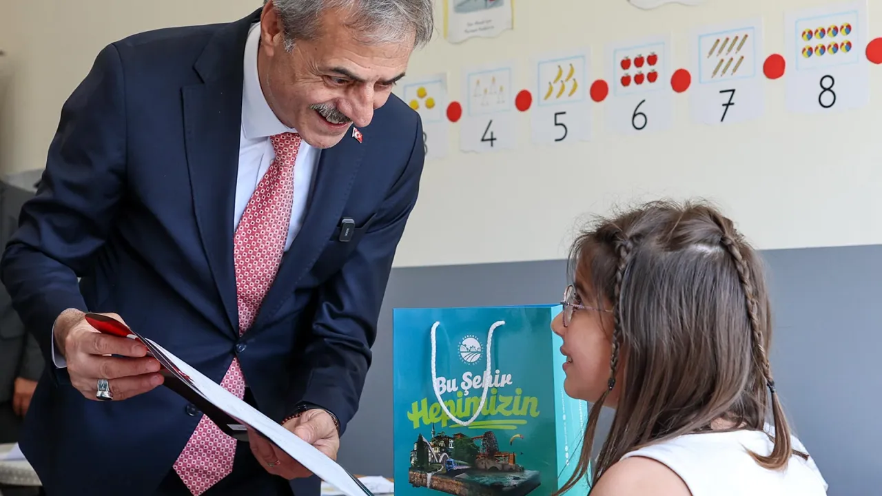 Minik öğrencilerin hazırladığı yöresel halk oyunu gösterisi ile başlayan karne töreninde Başkan Alemdar, okulda çocuklar tarafından çizilen resimler, geri dönüşüm malzemelerinden üretilmiş el emeği maketleri inceledi.