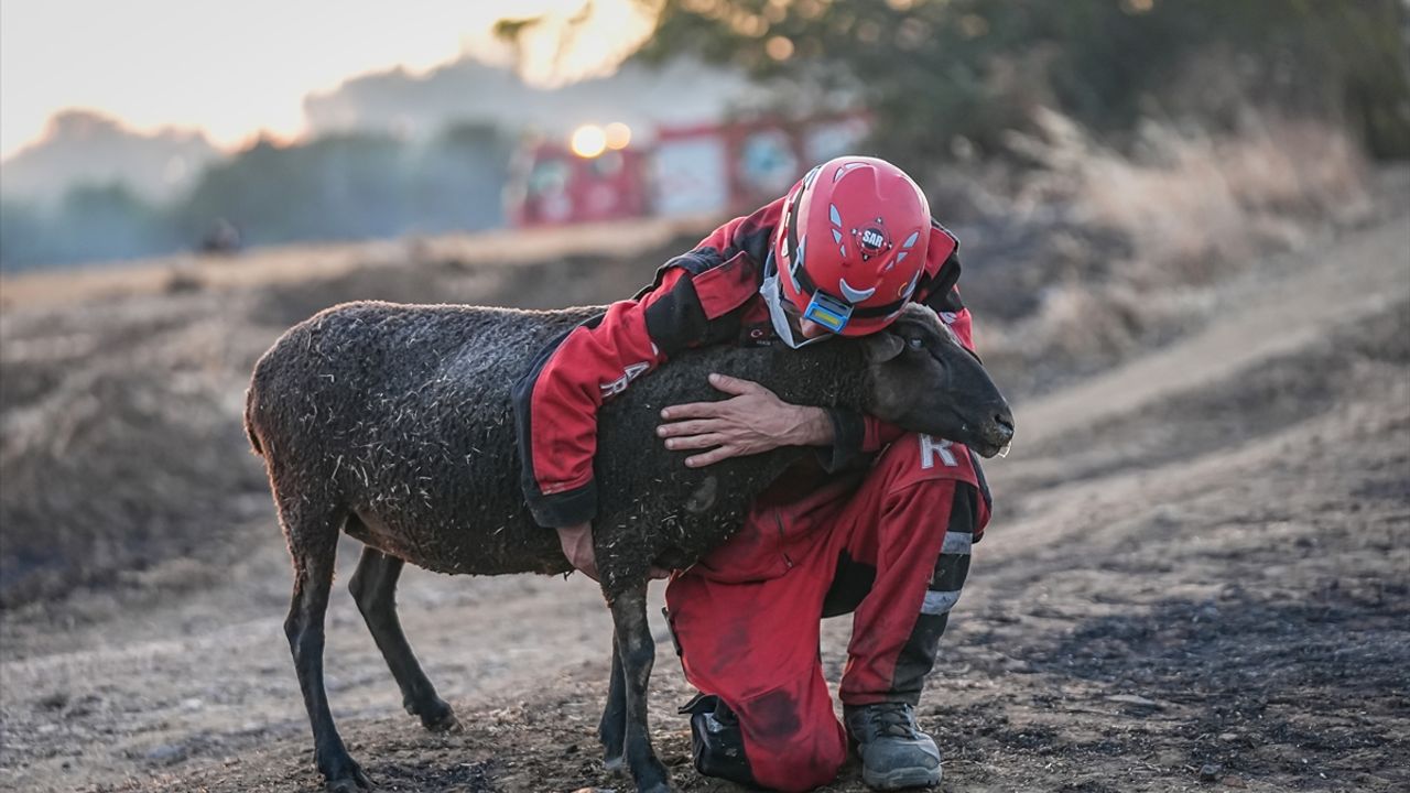 ÇANAKKALE (AA) - SERGEN SEZGİN/FATİH ÇAPKIN - Çanakkale'nin Gelibolu ilçesindeki orman yangınında görevli arama kurtarma gönüllüleri, alevlerin sardığı çiftlikte mahsur kalan ve üzerinde yanık oluşan koyunu kurtardı.