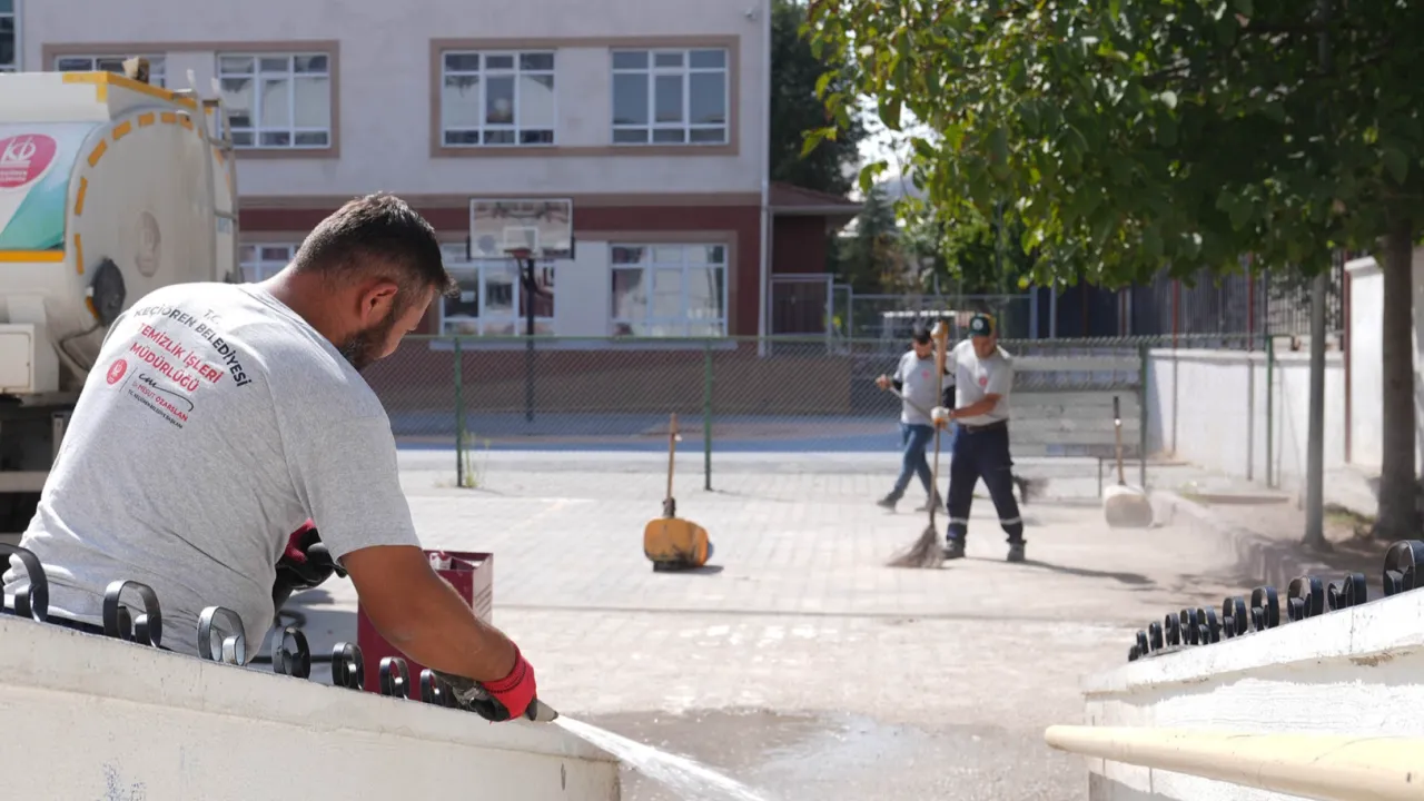 Keçiören Belediyesi Temizlik İşleri ile Park ve Bahçeler Müdürlüğü ekipleri tarafından yürütülen çalışmalarda, ilk olarak okul bahçeleri süpürge personeli tarafından detaylı şekilde temizleniyor. Ardından tankerlerle tazyikli su kullanılarak okul bahçeleri özenle yıkanıyor. Öğrencilerin teneffüslerini keyifle geçireceği alanlar ve okul bahçelerindeki dinlenme noktaları daha ferah hale getiriliyor. Öte yandan okul bahçelerinde ve çevresinde de düzenleme çalışmaları gerçekleştiriliyor. Ekiplerce sürdürülen çalışmalarda çim biçme, ağaç budama ve bitki dikimi yapılarak okullar daha estetik bir görünüme kavuşturuluyor.