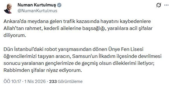 TBMM Başkanı Numan Kurtulmuş, Ankara'da meydana gelen trafik kazasında hayatını kaybedenler için sanal medya hesabından taziye mesajı yayımladı. Kurtulmuş, 'Ankara'da meydana gelen trafik kazasında hayatını kaybedenlere Allah'tan rahmet, kederli ailelerine başsağlığı, yaralılara acil şifalar diliyorum. Dün İstanbul'daki robot yarışmasından dönen Ünye Fen Lisesi öğrencilerimizi taşıyan aracın, Samsun'un İlkadım ilçesinde devrilmesi sonucu yaralanan gençlerimize de geçmiş olsun dileklerimi iletiyor; Rabbimden şifalar niyaz ediyorum' ifadelerini kullandı. (DHA)