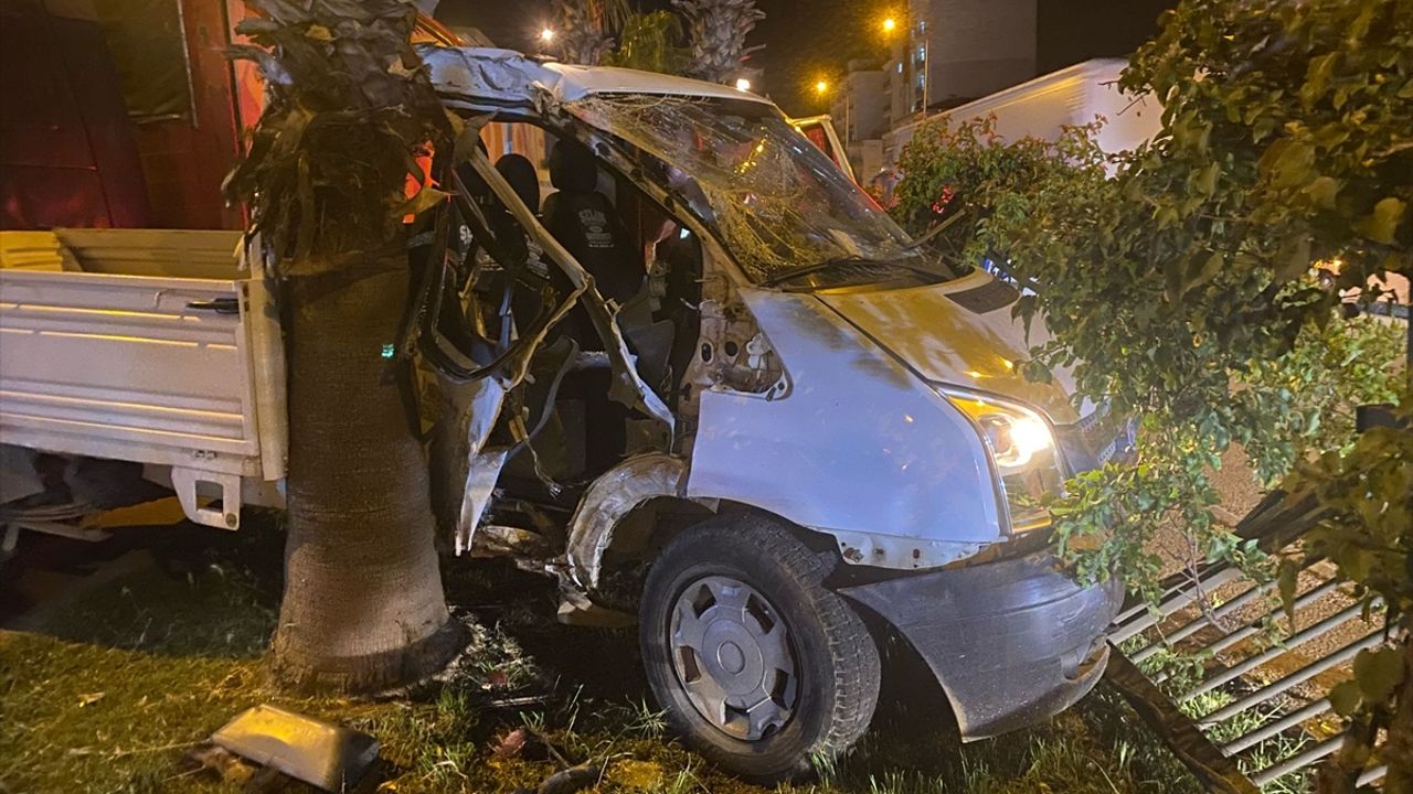 Çarpışmanın etkisiyle yoldan çıkan kamyonet, bariyerleri devirerek palmiye ağacına çarptı.