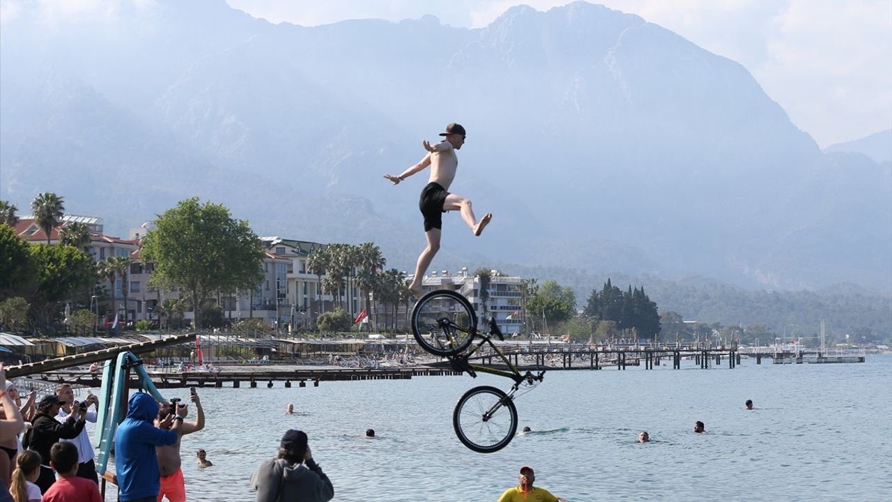 Sporcular, yarışın bitiş çizgisinde sahile kurulan rampadan denize bisikletleriyle atlayış gerçekleştirdi.