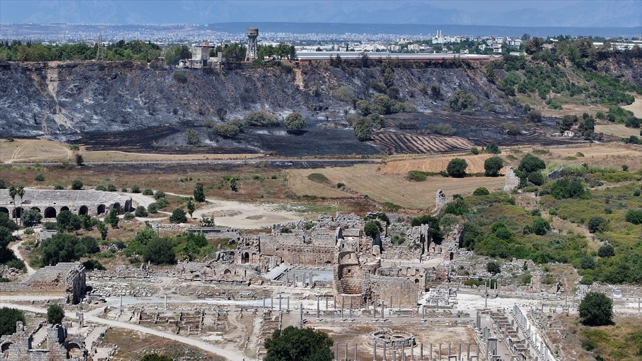Perge Antik Kenti sınırlarına yaklaşan ve büyük bölümü kızılçam ormanı olan yanan alanlar, dronla görüntülendi.