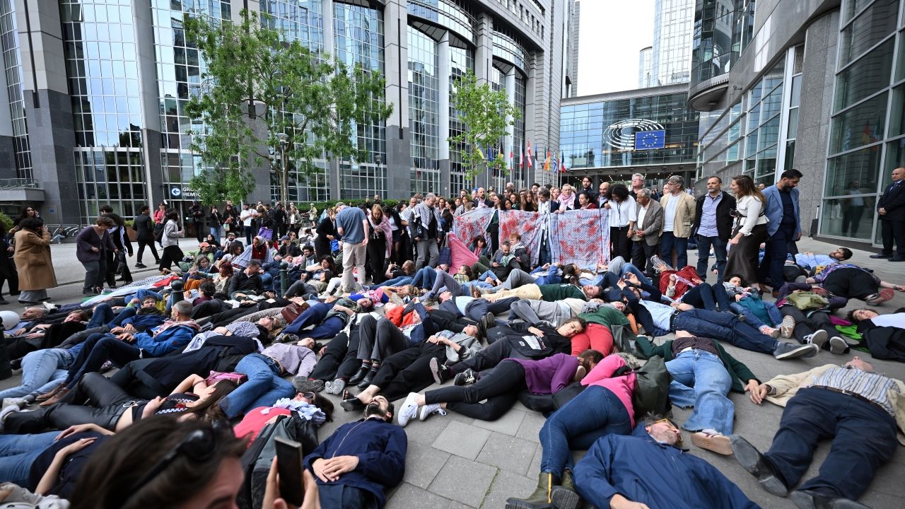 Brüksel'de AP önünde toplanan aktivistler, Gazze'de hayatını kaybedenleri simgeleyecek şekilde yere hareketsiz uzandı.