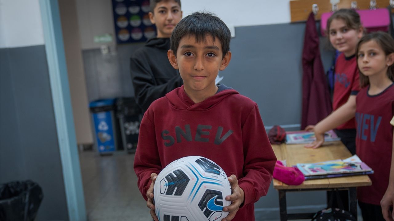 Okul müdürü Mehmet Şahin ve öğretmenler tarafından mektup ve topların dağıtıldığı sırada öğrencilerin mutluluğu yüzlerine yansıdı.