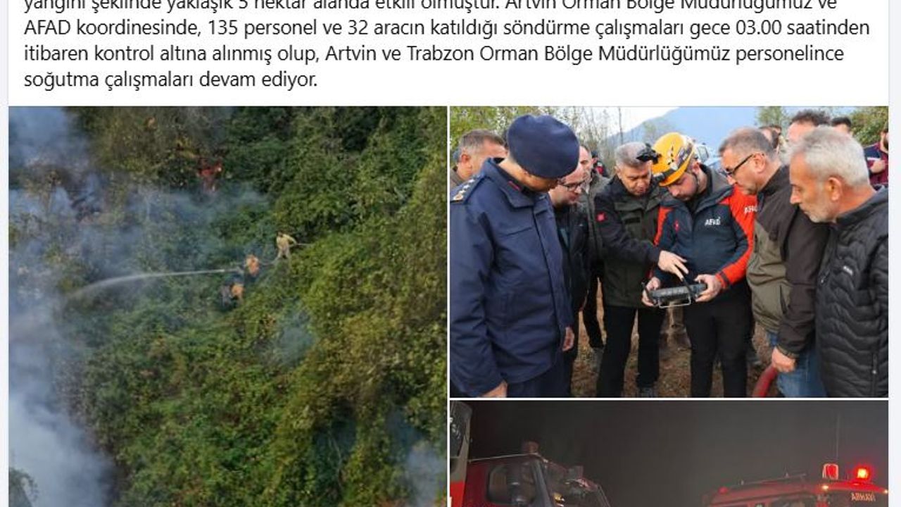 Artvin Orman Bölge Müdürlüğü'nün sosyal medya hesabından yapılan açıklamada, yangınının yaklaşık 5 hektarda etkili olduğu belirtildi. Orman Bölge Müdürlüğü ve AFAD koordinesinde, 135 personel ve 32 aracın katıldığı çalışmalar sonucu yangının kontrol altına alındığı vurgulanan açıklamada, Artvin ve Trabzon Orman Bölge Müdürlüğü personelince soğutma çalışmalarına devam edildiği belirtildi. (DHA)