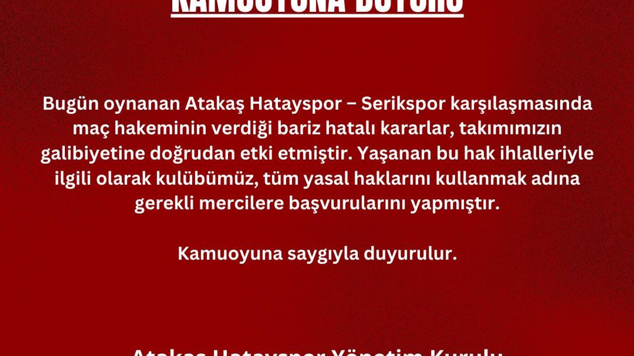 Hatayspor, Serikspor karşılaşmasının ardından resmi kanallarından yaptığı açıklamayla maç hakeminin verdiği bariz hatalı kararların müsabakanın sonucuna doğrudan etki ettiğini ifade etti. Bordo-beyazlı kulüp, yaşanan hak ihlallerinin kabul edilemez olduğunu vurgulayarak spor kamuoyunun dikkatini karşılaşmada yaşanan tartışmalı kararlara çekti. Kulüp yönetimi tarafından yapılan açıklamada, 'Oynanan Atakaş Hatayspor - Serikspor karşılaşmasında maç hakeminin verdiği bariz hatalı kararlar, takımımızın galibiyetine doğrudan etki etmiştir. Yaşanan bu hak ihlalleriyle ilgili olarak kulübümüz, tüm yasal haklarını kullanmak adına gerekli mercilere başvurularını yapmıştır. Kamuoyuna saygıyla duyurulur' denildi. (DHA)