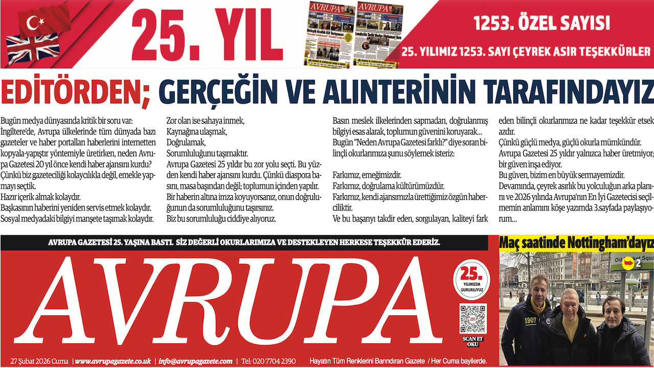 AVRUPA AJANSI (AVA) LONDRA - Avrupa Gazetesi 27 Şubat 2026 Baskısı dün gece çıktı, dağıtıldı. Londra'da açık olan tüm Türk marketleri, Süpermarket, Gıda Toptancıları bayilerinde bulabilirsiniz.... 24 Yıldır aynı heyecan ve istekle gazetemiz Londra’da her hafta basılıyor, dağıtılıyor. Avrupa Gazetesi Baskısı E-gazete sayfaları, 24. Yıla merhaba