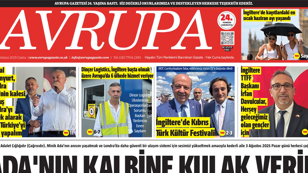 AVRUPA AJANSI (AVA) LONDRA - Avrupa Gazetesi 4 Temmuz 2025 Baskısı dün gece çıktı, dağıtıldı. Londra'da açık olan tüm Türk marketleri, Süpermarket, Gıda Toptancıları bayilerinde bulabilirsiniz.... 23 Yıldır aynı heyecan ve istekle gazetemiz Londra’da her hafta basılıyor, dağıtılıyor.
