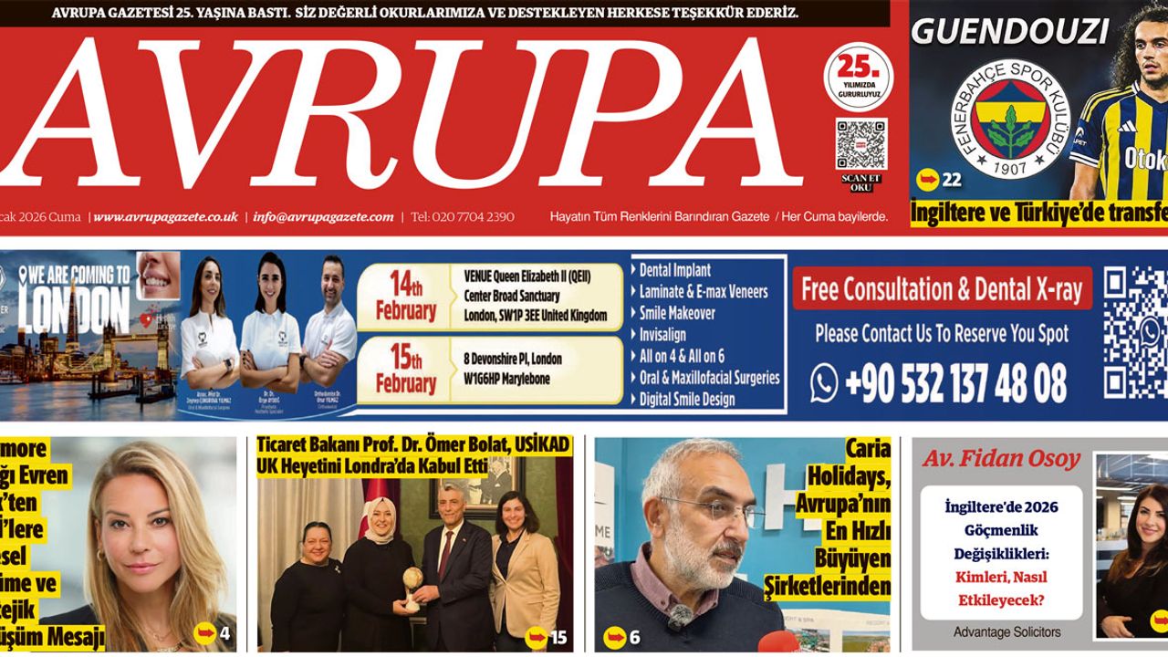 AVRUPA AJANSI (AVA) LONDRA - Avrupa Gazetesi 9 Ocak 2026 Baskısı dün gece çıktı, dağıtıldı. Londra'da açık olan tüm Türk marketleri, Süpermarket, Gıda Toptancıları bayilerinde bulabilirsiniz.... 24 Yıldır aynı heyecan ve istekle gazetemiz Londra’da her hafta basılıyor, dağıtılıyor. Avrupa Gazetesi Baskısı E-gazete sayfaları, 24. Yıla merhaba