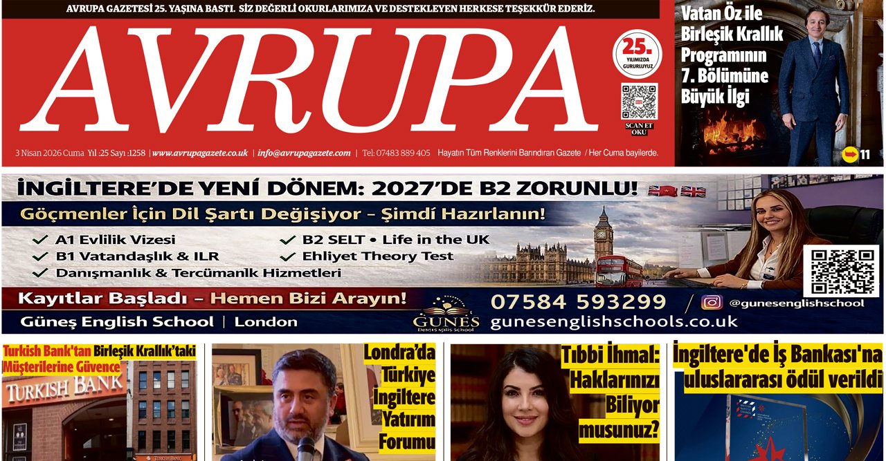 AVRUPA AJANSI (AVA) LONDRA - Avrupa Gazetesi 3 Nisan 2026 Baskısı dün gece çıktı, dağıtıldı. Londra'da açık olan tüm Türk marketleri, Süpermarket, Gıda Toptancıları bayilerinde bulabilirsiniz.... 25 Yıldır aynı heyecan ve istekle gazetemiz Londra’da her hafta basılıyor, dağıtılıyor. Avrupa Gazetesi Baskısı E-gazete sayfaları