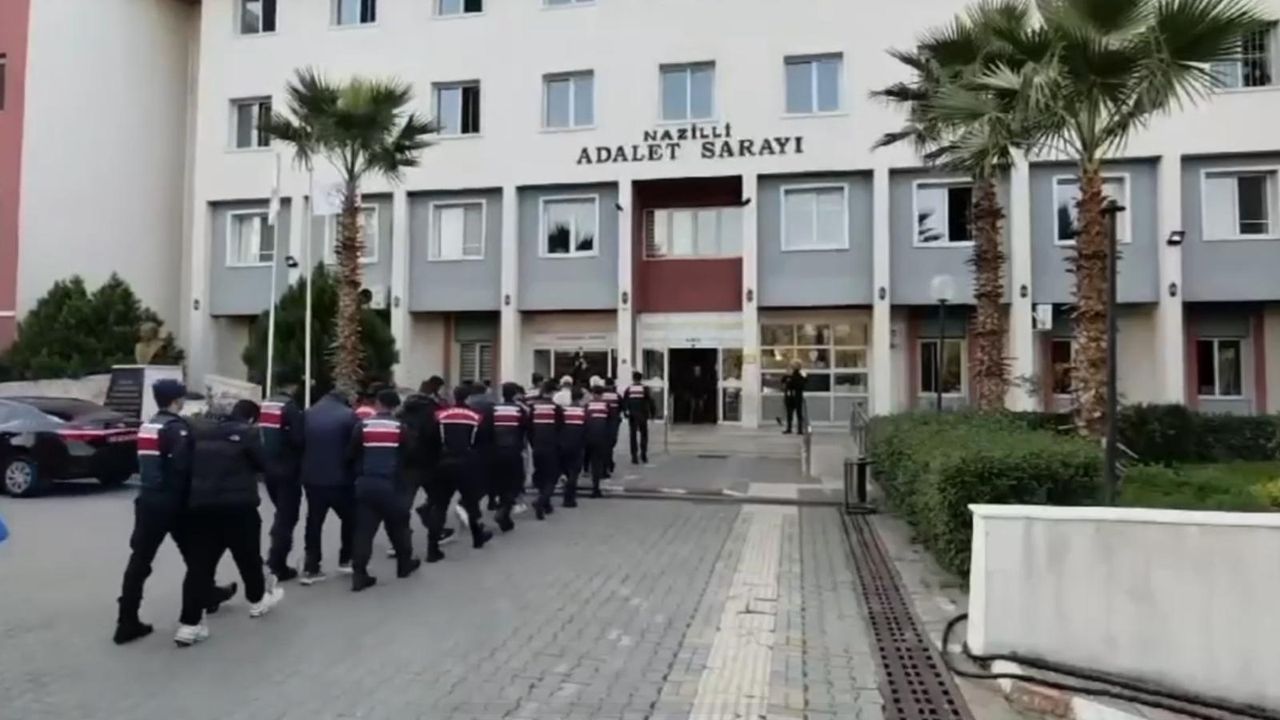 Geniş güvenlik kapsamında Nazilli Adliyesine sevk edilen 19 şüpheli mahkemeye çıkarıldı. Şüpheliler hakkında 'suç işlemek amacıyla örgüt kurma', 'nitelikli dolandırıcılık', 'kişisel verilerin hukuka aykırı ele geçirilmesi' ve 'tehdit' suçlarından işlem yapıldı. Şüphelilerden 14'ü tutuklanarak Nazilli E Tipi Kapalı Ceza İnfaz Kurumuna gönderilirken, 5 kişi adli kontrol şartıyla serbest bırakıldı. Yurt dışına kaçan şüpheli için ise yakalama kararı çıkarıldı. (DHA)