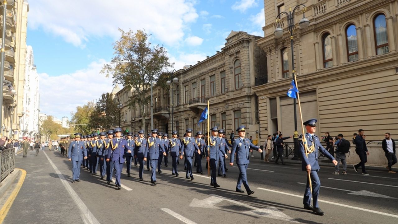 "Zafer Günü" kutlamaları kapsamında Bakü'nün çeşitli bölgelerinde düzenlenen yürüyüşlere, askerler ve Karabağ Savaşı gazileri katıldı.