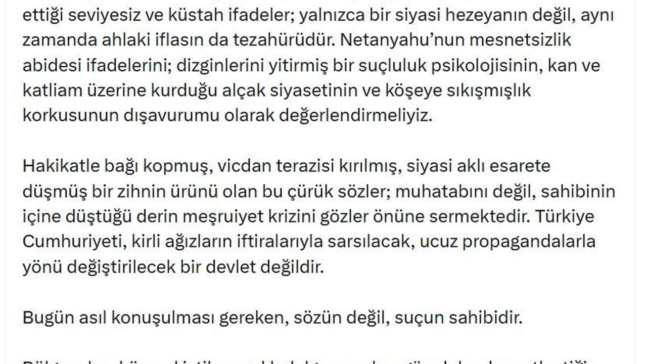 'Bölgesel ve küresel istikrarsızlık dalgasının her gün daha da sertleştiği; bölgemizdeki huzur ve güvenlik ikliminin siyonist hesaplarla dağıtılmak istendiği, emperyalizmin bu kanlı ve kirli oyuna çanak tuttuğu günümüzde; masum sivilleri hunharca katleden bir terör makinesinin Sayın Cumhurbaşkanımıza, ülkemize, devletimize söz söylemeye kalkışması, utanmazlığın ve küstahlığın ulaştığı yeni bir dip noktadır. Gazze'de çocukların üzerine yağan bombaların hesabını veremeyenler; Batı Şeria'yı gasbeden, Lübnan'ı işgal eden, Suriye'nin egemenliğini tehdit eden ve İran'da gayrimeşru yollarla rejim mühendisliğine soyunan, çevre ülkelerin iç dengelerini bozmayı alışkanlık haline getiren bu anlayış; bölgeyi ateş çemberine çeviren saldırgan politikalarıyla insanlık vicdanında mahkum olmuştur ve şimdi dikkatleri başka yöne çekmek için gürültü çıkarmaktadır. Barışı çalan, güvenliği talan eden, insanlığın ortak değerlerini yağmalayan bu yaklaşım; sadece bir saldırganlık değil, aynı zamanda bir kleptokrasi ve ahlaki çöküştür.'