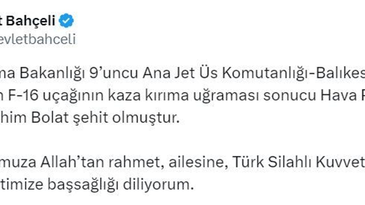 ANKARA, (DHA)- MHP Genel Başkanı Devlet Bahçeli, Balıkesir'den kalkış yapan F-16 uçağının kaza kırıma uğraması sonucu şehit olan Hava Pilot Binbaşı İbrahim Bolat için taziye mesajı yayımladı.