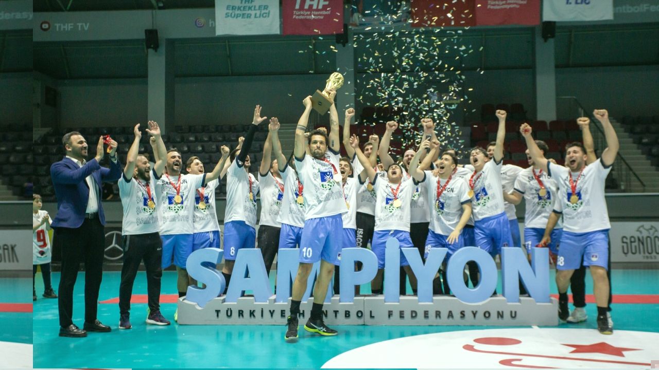 Hentbol Erkekler 1. Lig şampiyonu Bahçelievler Belediyespor'a kupasını THF Başkan Vekili Kenan Gökmen ve THF Genel Koordinatörü Prof. Dr. Serdar Eler takdim etti.